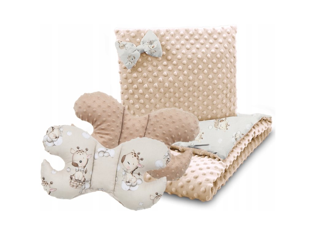 Комплект одеяла и възглавници за бебешки колички. Възглавниците и одеялата са двустранни. Едната страна е от памучен плат с принт, а другата е от удобен минк плат.