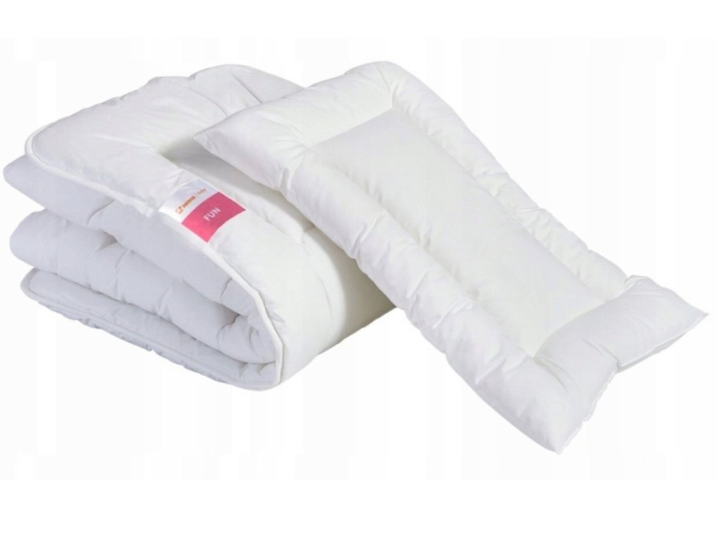 Комплектът от пухено одеяло и възглавница е изработен от издръжлива микрофибра. Одеялото е стегано, което гарантира неговата издръжливост. Одеялото е подходящо за всички сезони и е много леко, което го прави идеално за най-малките деца. Пълнежът е напълно хипоалергенен и може да се пере при температури до 60 градуса за максимална хигиена.