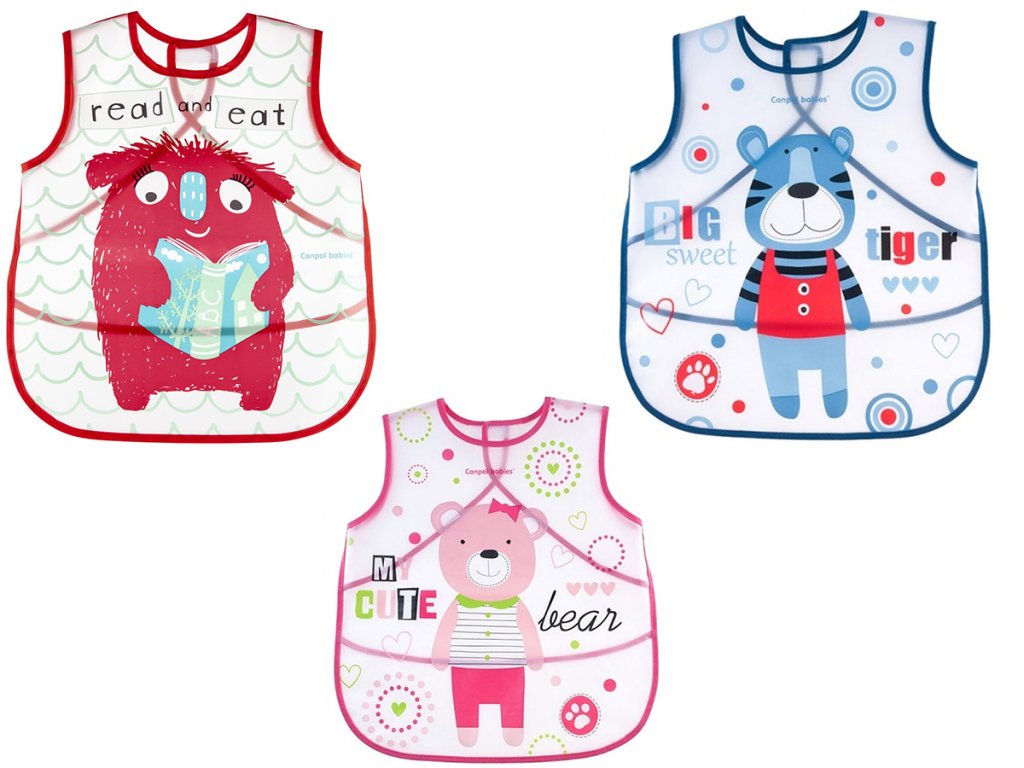 Стилна престилка с закопчаване за деца на възраст от 12 месеца нагоре. Изработена е от издръжлив материал, който не се намокри и е лесен за поддържане. Престилката има ръкави и се закопчава отзад. Оборудвана е с джоб, който улавя падащата храна.