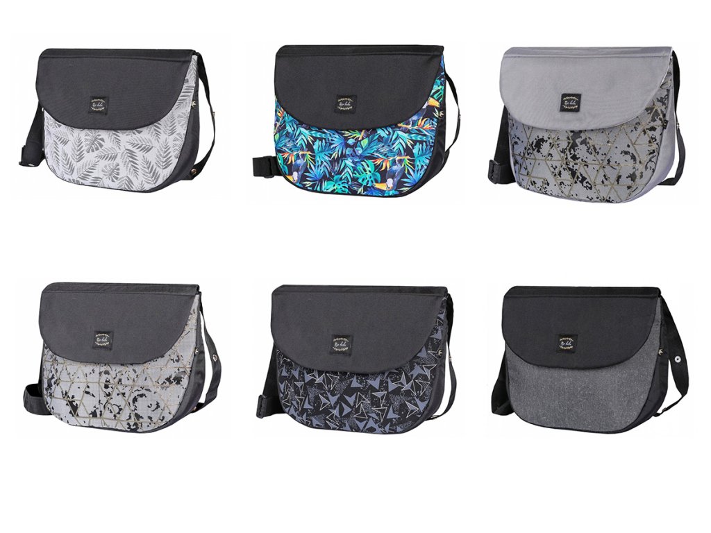 Чантата може да се носи на рамо или да се закачи на количката. Основното отделение може да се затваря с цип и капак с велкро.