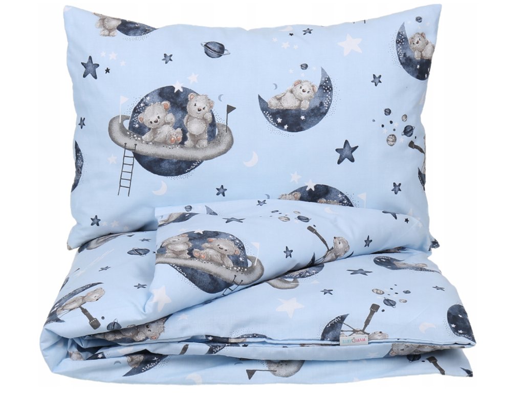 Памучно спално бельо за пухено одеяло с размери 120x90 cm и възглавница с размери 60x40 cm. Спалното бельо има цип.
