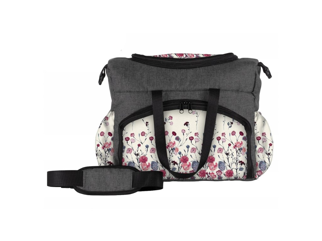 Чантата може да се носи на рамо или да се закачи на количката. Основното и страничните отделения могат да се затварят с цип. Вътре в голямото отделение има по-малки отделения за бебешки бутилки или други аксесоари.