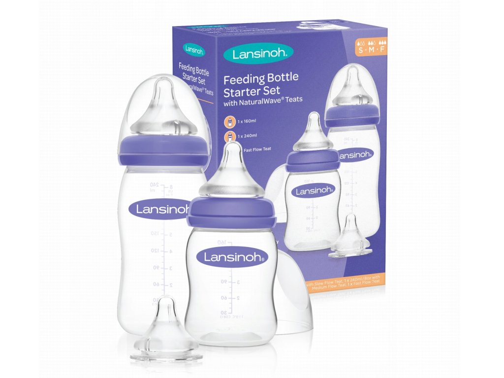 Комплектът включва бебешка бутилка с обем 160 мл и 240 мл + 3 биберона (S, M, F - бавен, среден, бърз). Бебешките бутилки Lansinoh с биберони NaturalWave® са специално проектирани за кърмени бебета. Те позволяват на бебето да извършва подобно движение на езика, както при кърмене. По този начин бебето няма проблем да преминава от кърмене към хранене с бутилка.