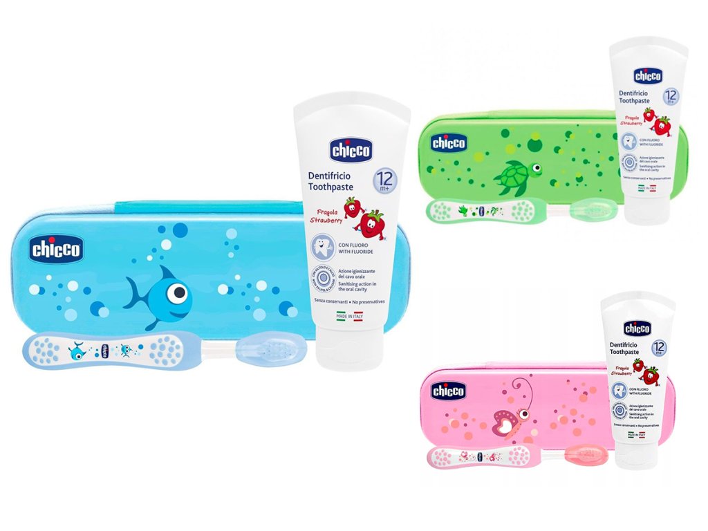 Комплектът за почистване на зъбите включва мека четка за зъби, паста за зъби с аромат на ягода за деца и практичен калъф за пътуване. Мека четка за зъби за деца от 12 месеца. Четката е подходяща за научаване на децата да си мият зъбите самостоятелно.