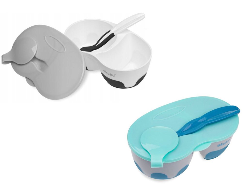 Двукомпонентната купа с две отделения и лъжица е подходяща за пътуване и за съхранение на бебешка храна в хладилника. Лъжицата може да се закрепи към купата, като ви осигурява много компактен и практичен комплект за хранене за разходки и пътувания.