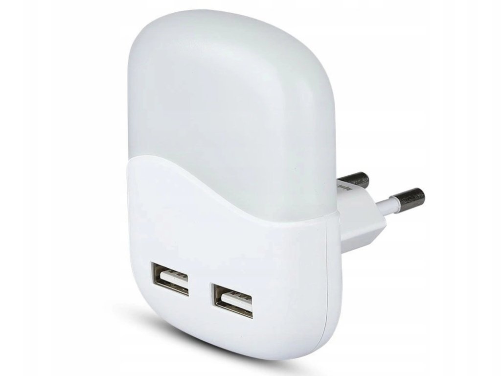 Тази дискретна нощна лампа, която не пречи, може да се използва във всеки електрически контакт. Лампата има сензор за движение и се включва само когато е тъмно. Лампата е оборудвана с два висококачествени USB порта (2.0A/14W) за зареждане на телефона ви или други устройства.