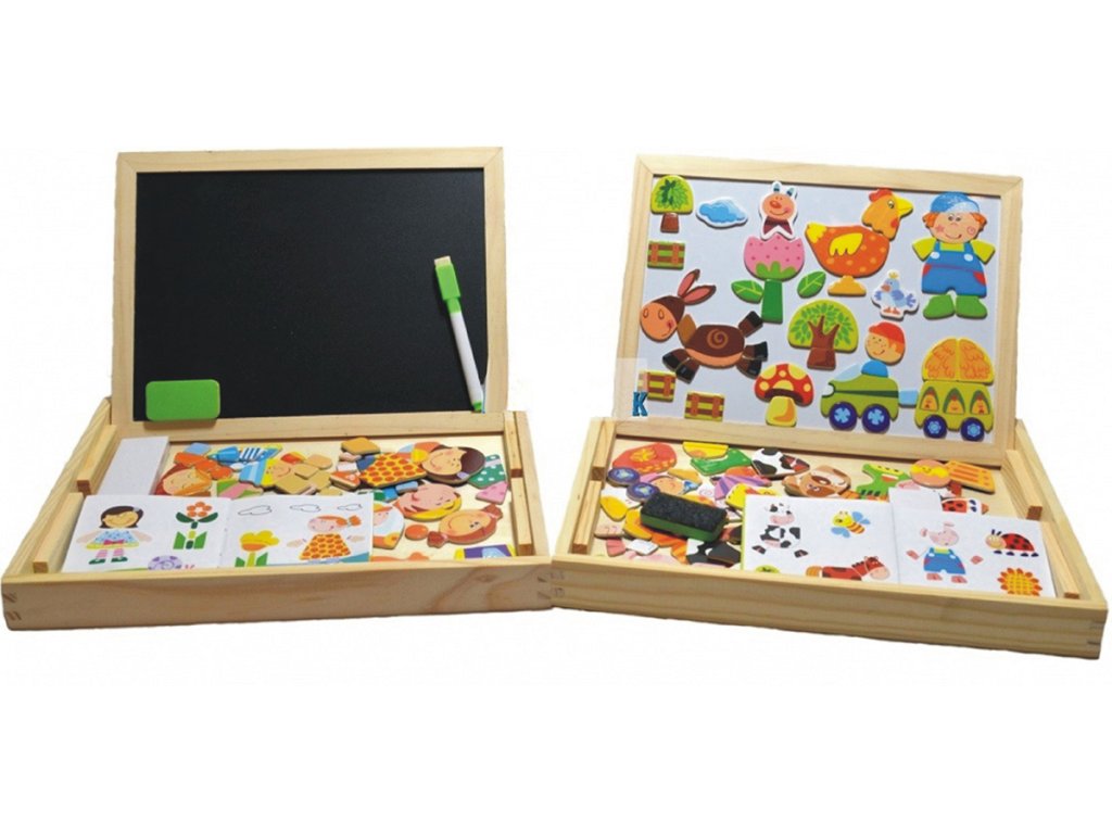 Дъската включва магнитни играчки, тебешир и гума за изтриване.