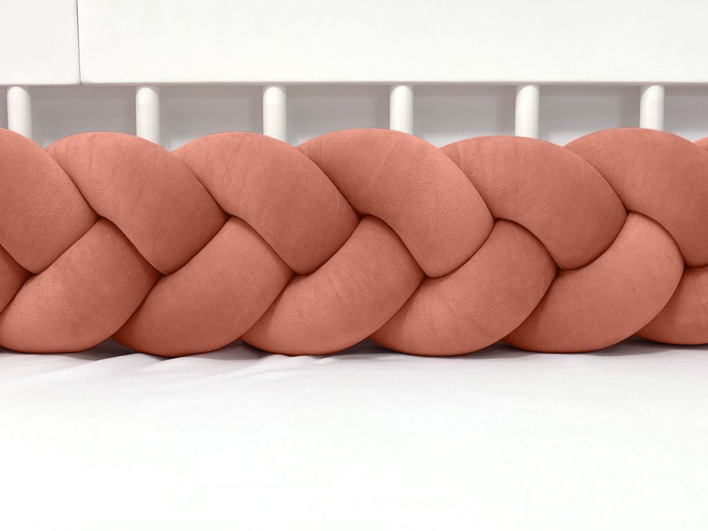 Дизайнерски ръчно изработен протектор/ограда за детски легла, изработен от висококачествени материали. Плетената ограда е много мека и може да се използва в детско легло, като гнездо или на диван.