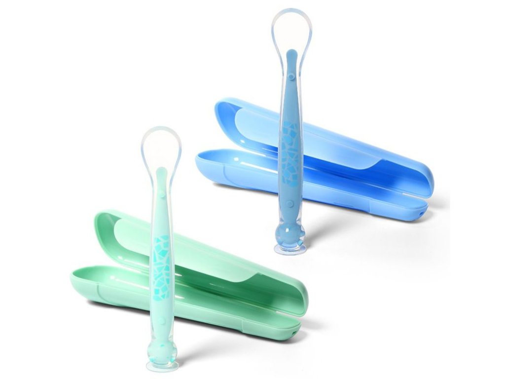 Първата лъжичка за хранене се предлага с практичен калъф. Подходяща е за пътуване и ежедневна употреба. Лъжичката е изработена от безопасен и мек силикон и е снабдена с вендуза. Благодарение на вендузата можете лесно да я поставите на масата.