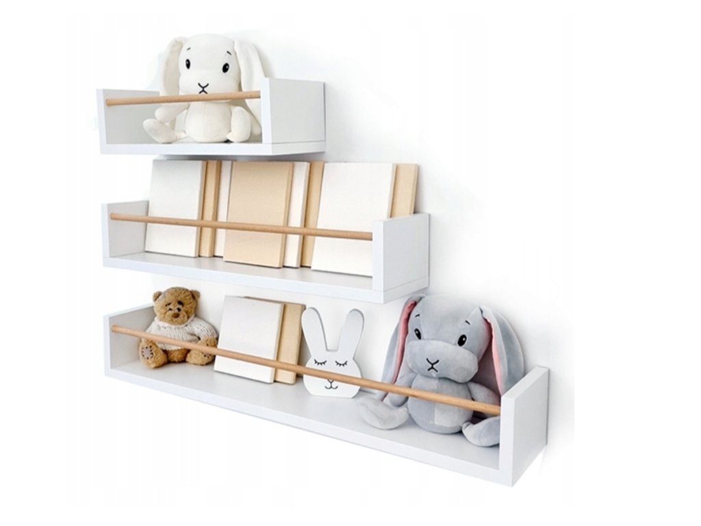 Имате ли ограничено място за съхранение? Играчките и разхвърляните вещи са навсякъде? Практичните рафтове за детски стаи (3 броя в опаковка) предлагат достатъчно място за всякакви играчки. Освен това, те имат преграда отпред, която предотвратява изпадането на играчките. Белият цвят и скандинавският стил гарантират, че те се вписват перфектно във всяка детска стая.