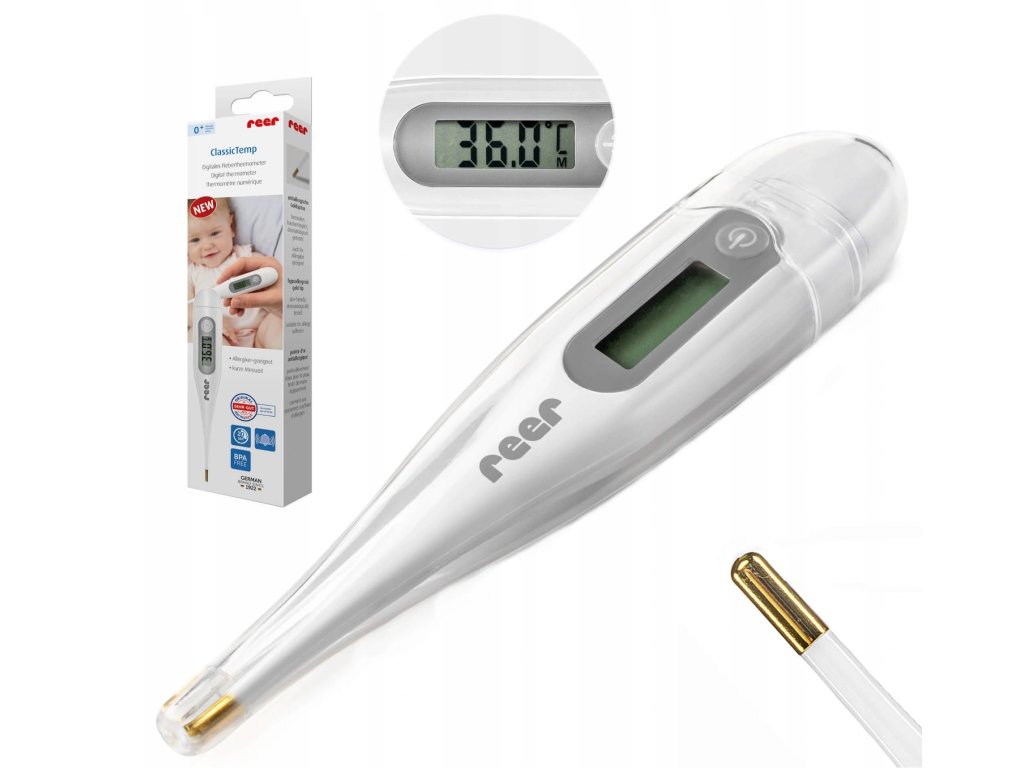 Класически детски цифров термометър с позлатен накрайник. Той е специално проектиран за деца за високоточно измерване на температурата в устата, под мишницата или в ректума.
