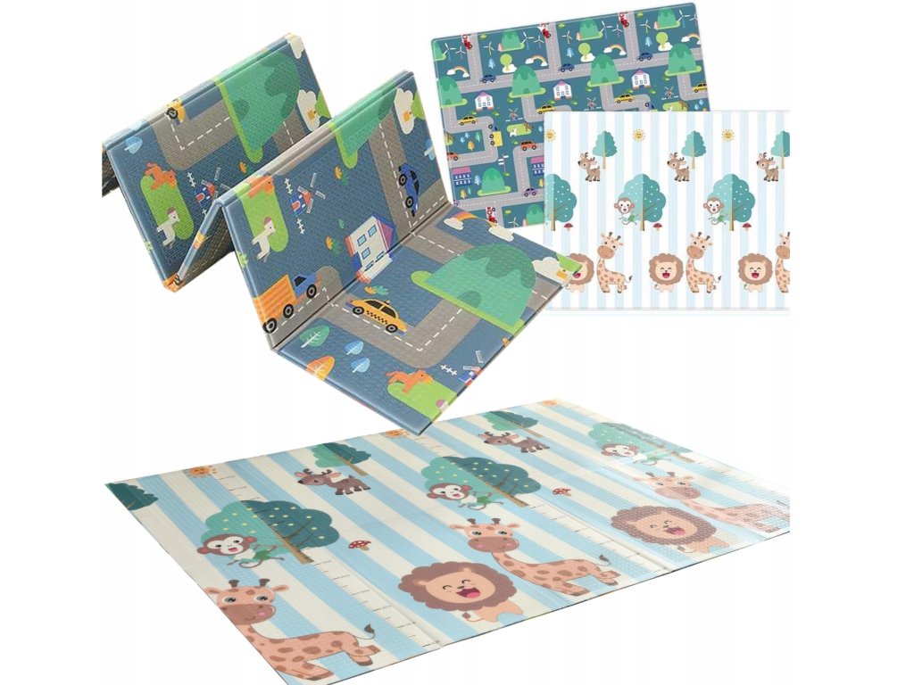 Двустранна сгъваема игрална постелка за деца. Постелката се предлага в практична чанта за съхранение и транспортиране.