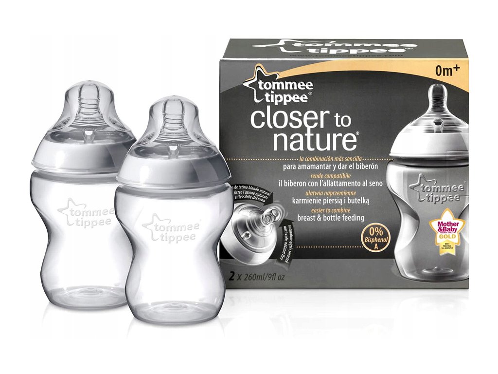 Бутилките Tommee Tippee имат специално оформен биберон, който наподобява естественото кърмене. Те са оборудвани с практична капачка за биберона. Бутилките са подходящи за новородени. Биберонът на бутилката е ергономично оформен и гъвкав. Бутилките са оборудвани с антиколичен клапан, който намалява риска от подуване на корема при бебетата, дължащо се на поглъщане на въздух.